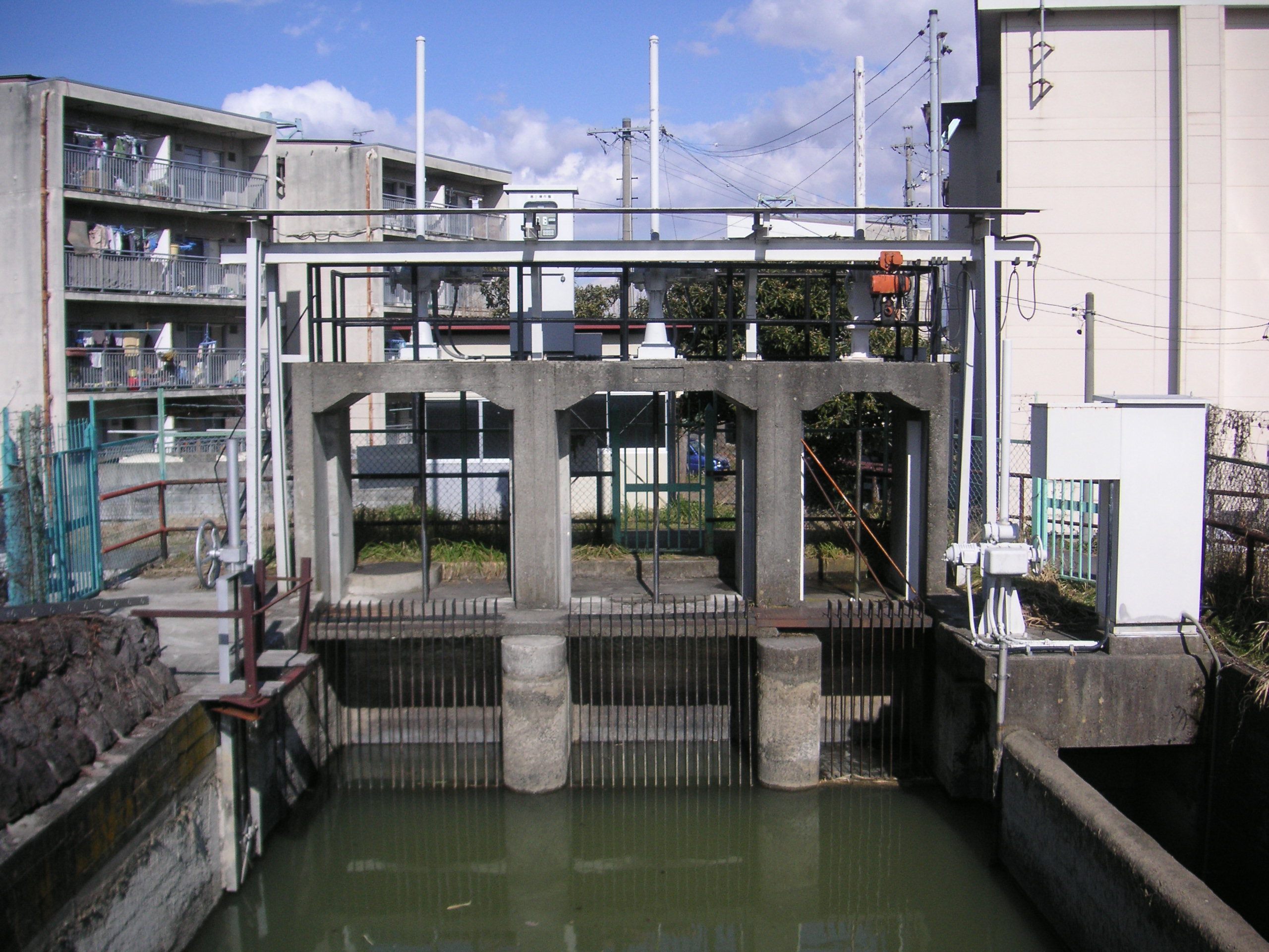 農業用水路、特に幅が広くて流れの早い水路にはゴミを下流に流さないように、また人が落ちても流されないように場所ごとにスクリーンと呼ばれる防護柵を設置しています。